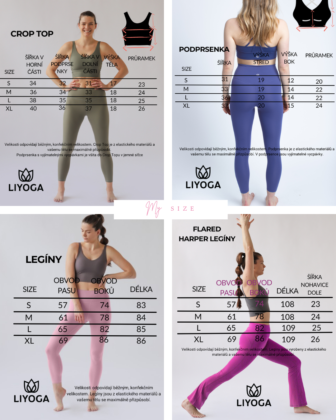 Výběr správné velikosti je základem absolutního pohodlí – a právě komfort je pro nás v LIYOGA tím nejdůležitějším. Aby sis mohla užít pohyb i běžný den bez kompromisů, připravili jsme přehledný návod, jak si na našem e-shopu zvolit tu nejlepší velikost legín, podprsenek a crop topů.